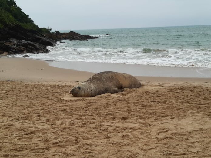 O elefante-marinho localizado nesta segunda-feira pode ser avistado durante alguns dias descansando nas praias da região. Ao avistar um Pinípede, lembre-se: