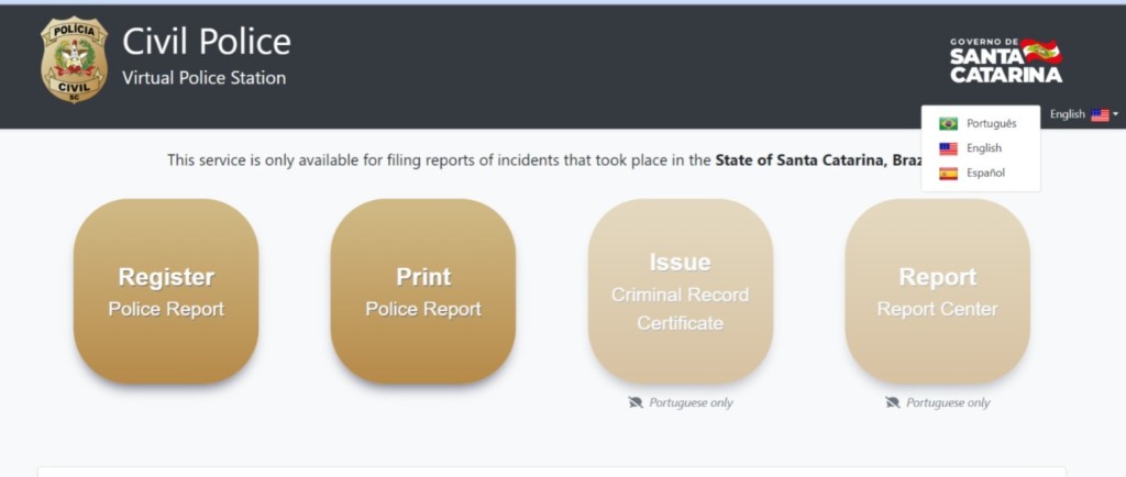 Já o registro de Boletins de Ocorrências por estrangeiros via portal foi solicitado pela PCSC e tornado acessível graças à integração realizada pelo Ciasc no sistema da Delegacia Virtual. A nova versão da Delegacia Virtual que possibilita o registro de Boletins de Ocorrência por estrangeiros passou a oferecer instruções e interface nos idiomas espanhol e inglês.