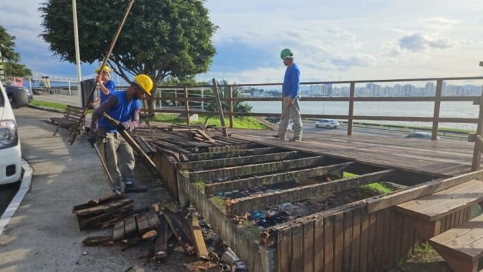 A Prefeitura de Florianópolis iniciou na tarde desta quarta-feira (26) a reconstrução do mirante público da Beira-mar Norte que fica ao final da Rua Felipe Schmidt, no Centro. A estrutura de madeira foi desmontada e deverá ficar pronta nos próximos dias. Os serviços estão sendo conduzidos pela Secretaria de Limpeza e Manutenção Urbana em parceria com a Secretaria de Transportes e Infraestrutura.