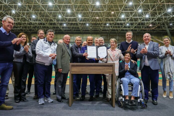 O governador Jorginho Mello e o presidente da Federação das Indústrias de Santa Catarina (Fiesc), Mario Cezar de Aguiar, assinaram nesta quinta-feira, 4, o protocolo para a transferência do Complexo Esportivo Bernardo Wolfgang Werner para o município de Blumenau. O ato contou ainda com a presença do prefeito de Blumenau, Mario Hildebrandt, da vice-prefeita Maria Regina Soar, de deputados estaduais e autoridades locais.
