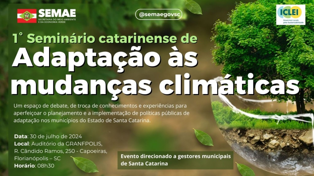 O trabalho do Governo do Estado para preparar os municípios catarinenses para lidarem com adversidades climáticas, às quais Santa Catarina está exposto, terá mais uma importante oportunidade de capacitação. A Secretaria do Meio Ambiente e da Economia Verde (SEMAE) promove no dia 30 de julho, o 1º Seminário Catarinense de Adaptação às Mudanças Climáticas, no auditório da Associação dos Municípios da Grande Florianópolis (GrandFpolis).