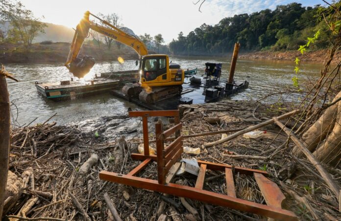 O processo ocorre assim: a escavadeira embarcada retira os sedimentos, galhos e árvores tombadas diretamente dos leitos e margens dos rios, colocando-os nas balsas. Estas, por sua vez, são rebocadas até um ponto de descarte temporário conhecido como “bota espera”. No bota espera, outra escavadeira em terra descarrega os materiais das balsas e os deixa secar. Uma vez secos, os detritos são finalmente transportados por caminhões até o local de descarte definitivo, o “bota fora”.