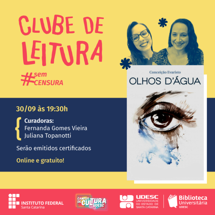 O Clube de Leitura Sem Censura, da Biblioteca Universitária (BU) da Universidade do Estado de Santa Catarina (Udesc), está com inscrições abertas para o encontro de setembro. O evento gratuito e aberto ao público ocorre no dia 30, às 19h30, pela plataforma Microsoft Teams, e aborda o livro “Olhos D’água”, da escritora brasileira Conceição Evaristo.