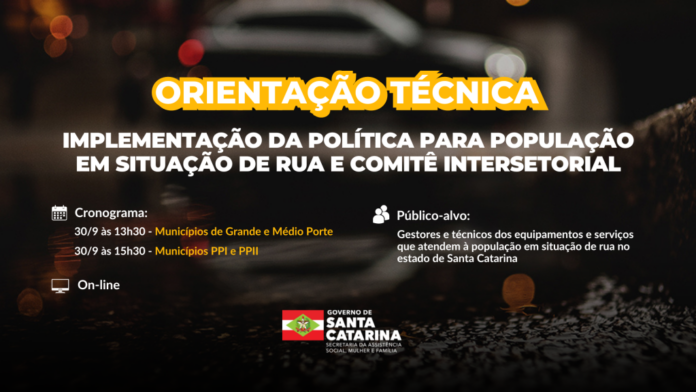 A Secretaria de Estado da Assistência Social, Mulher e Família (SAS) está com inscrições abertas para a orientação técnica sobre a implementação de política para população em situação de rua e comitê intersetorial que acontece no dia 30 de setembro. O público-alvo são gestores e profissionais que atuam nos equipamentos que trabalham com esse público nos municípios.