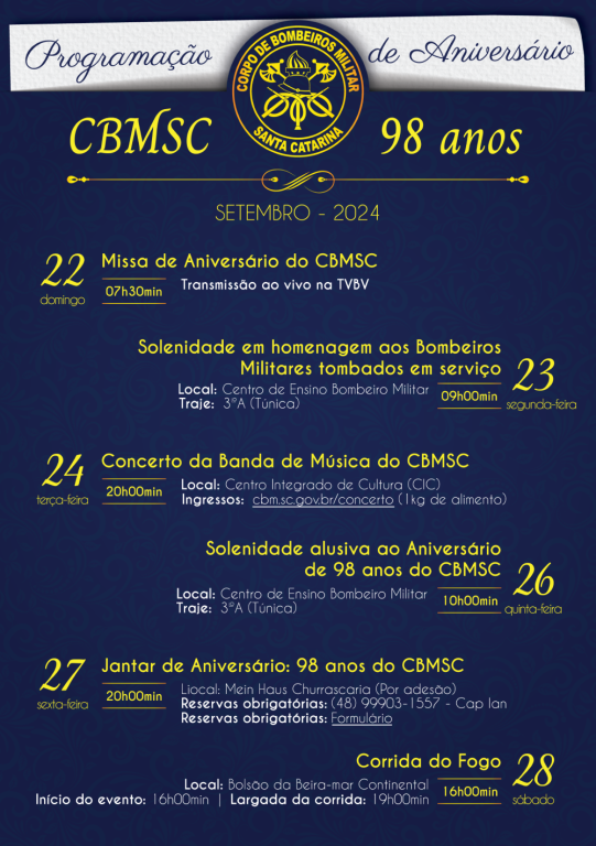 “É com grande orgulho que divulgamos a programação de comemoração aos 98 anos de nossa corporação. A programação conta com eventos todos os dias, que engrandecem o Estado de Santa Catarina, a sociedade, mas também valoriza o trabalho dos bombeiros militares que defendem diariamente as pessoas ” afirma, o comandante-geral do CBMSC Fabiano Bastos das Neves.