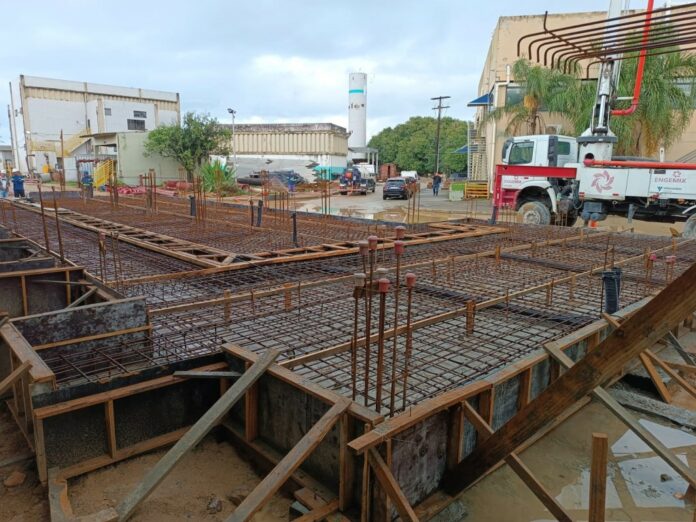 Foram utilizados um volume de 57 m³ de concreto para concretar a laje de fundo da Casa de Sopradores e Biofiltros. Essa estrutura é anexa ao Tanque de Aeração e vai abrigar as máquinas responsáveis por injetar ar dissolvido no efluente. O objetivo é acelerar o processo de decomposição da matéria orgânica com microorganismos, no chamado tratamento biológico.