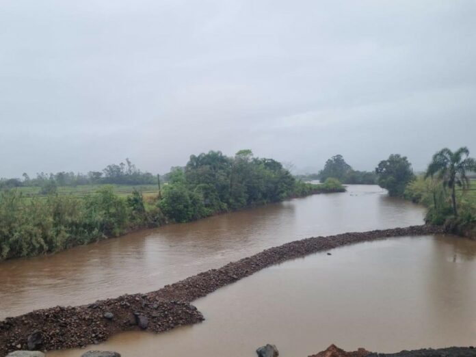 Em nenhum momento os trabalhos no local foram paralisados. Ocorre que com a chuva desta semana, não foi possível a sequência dos trabalhos. Assim que o nível do rio baixar, os trabalhos serão retomados para deixar a ponte funcional.