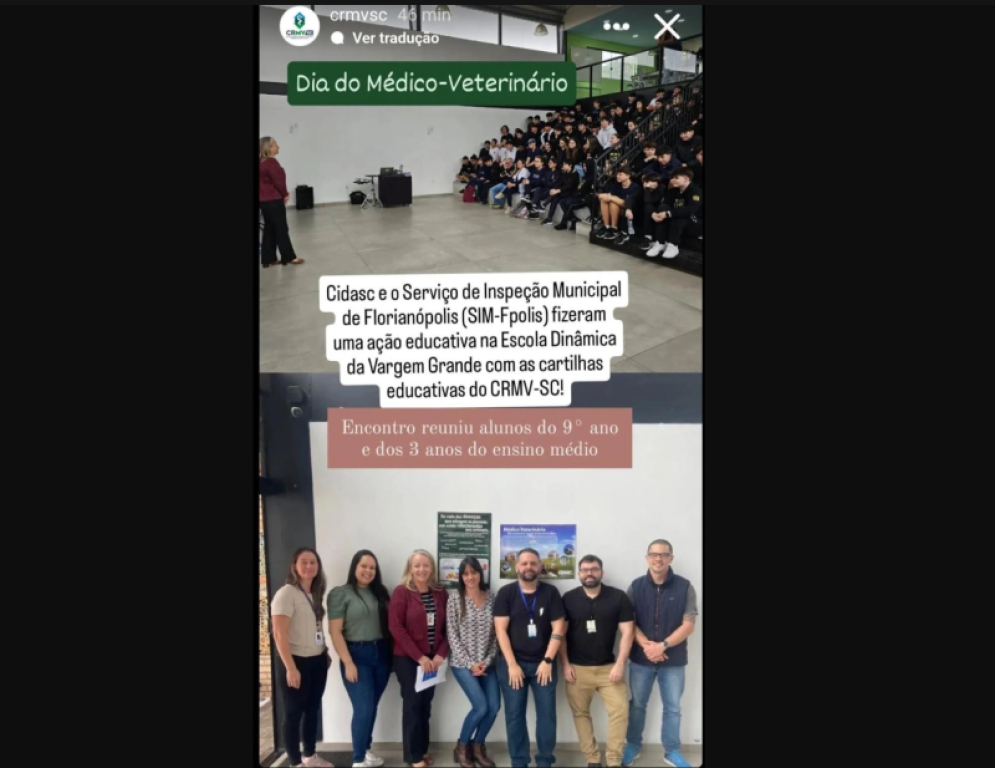 Em comemoração ao dia do médico-veterinário, no dia 09 de setembro, a Prefeitura Municipal de Florianópolis, por meio do Serviço de Inspeção Municipal (SIM-Fpolis), e a Companhia Integrada de Desenvolvimento Agrícola de Santa Catarina (CIDASC) fizeram uma ação educativa na Escola Dinâmica da Vargem Grande.