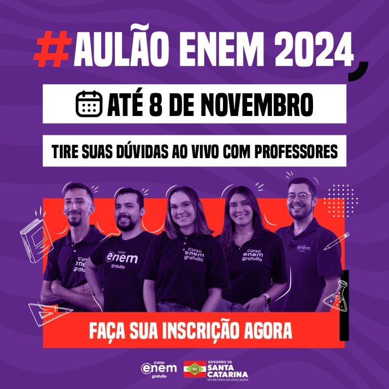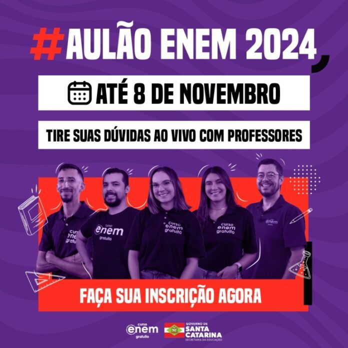 O Exame Nacional do Ensino Médio 2024 (Enem) será realizado nos dias 3 e 10 de novembro, e Santa Catarina oferece uma série de aulas preparatórias on-line e gratuitas, com foco nos temas mais cobrados nas últimas edições do exame. A iniciativa é uma parceria da Secretaria de Estado da Educação (SED) com a Rede Enem, através da plataforma Enem Gratuito.