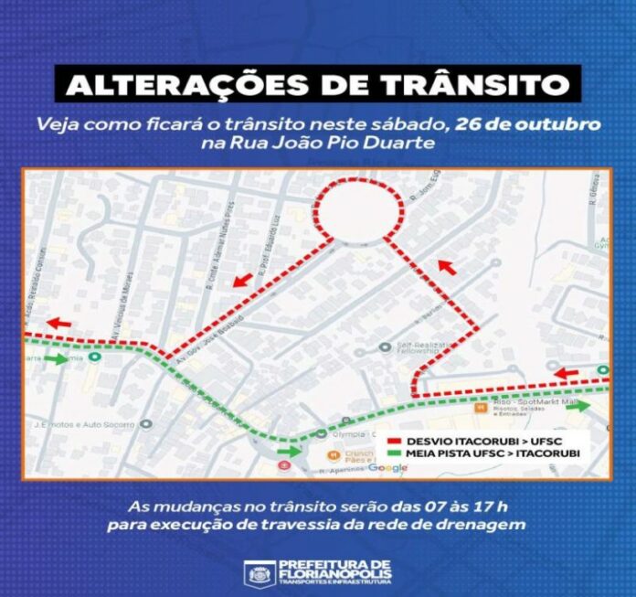 A Prefeitura de Florianópolis informa que no próximo sábado (26) a Rua João Pio Duarte, a geral do Córrego Grande, terá trecho interditado no período entre 7 e 17hs para execução de travessia da rede de drenagem. Por conta disso, o trânsito na via será desviado na área da rótula recém-implantada, de modo que os motoristas que deslocarem-se sentido UFSC vão precisar pegar à direita na Rua Munique, depois à esquerda na Rua Diná Calixto, contornar a rótula da Praça Padre José de Anchieta e seguir pela Avenida Governador José Boabaid até alcançar novamente a Rua João Pio Duarte. Já os motoristas que estiverem vindo na direção contrária vão poder transitar pela geral do Córrego em meia pista.