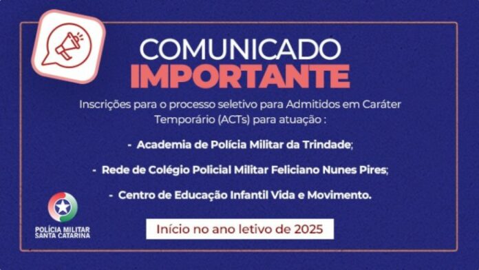 A Polícia Militar de Santa Catarina (PMSC) abriu na terça-feira, 29, as inscrições do processo seletivo para profissionais admitidos em caráter temporário (ACT) atuarem na rede de Colégio Policial Militar Feliciano Nunes Pires (CFNP). Há vagas para as unidades de Florianópolis, Lages, Blumenau, Joinville, Laguna e Jaraguá do Sul, e para o Centro de Educação Infantil Vida e Movimento (CEIVM). em Florianópolis, para o ano letivo de 2025.