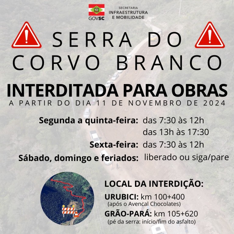 A Secretaria da Infraestrutura e Mobilidade (SIE) informa que a Serra do Corvo será interditada para obras a partir do dia 11 de novembro. A interrupção ocorre nos KM’s 100,4 – em Urubici – e 105,6 no município de Grão Pará.