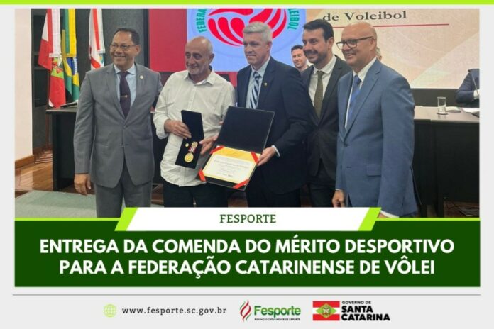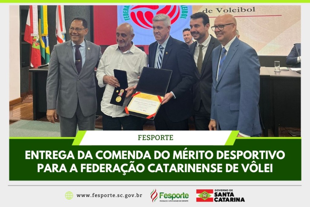 Na noite da última terça-feira, 5, a Fesporte participou da cerimônia de homenagens a medalha Marcílio César Ramos Krieger e da entrega da Comenda do Mérito Desportivo. o presidente Freibergue Nascimento teve a honra de entregar a Comenda para a Federação Catarinense de Vôle. A entidade foi uma das homenageadas da noite na Assembleia Legislativa do Estado de Santa Catarina pelo seu trabalho realizado em prol do esporte no estado.