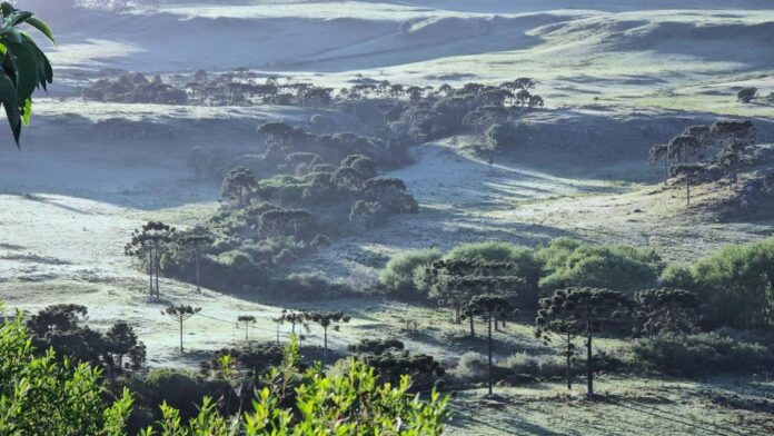 A madrugada deste sábado, 9, foi marcada por um cenário de tempo firme e frio em Santa Catarina. Embora a previsão para o final de semana seja de sol e sem chuva, o estado experimentou temperaturas baixas nas áreas mais altas, especialmente no Planalto Sul e na Serra Catarinense, onde geada foi registrada pontualmente.