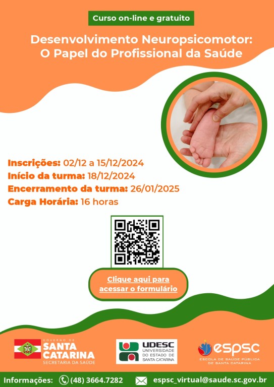 A Secretaria de Estado da Saúde de Santa Catarina (SES/SC), por meio da Escola de Saúde Pública (ESPSC), em parceria com a Diretoria de Atenção Primária à Saúde (DAPS) e a Universidade do Estado de Santa Catarina (UDESC), está promovendo a 4ª edição do curso “Desenvolvimento Neuropsicomotor: o papel do profissional de saúde”.