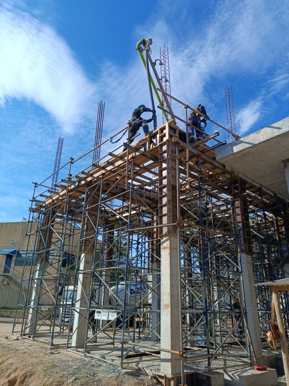 A operação concluiu a construção dos pilares e vigas da casa de sopradores e biofiltro, estrutura que vai receber os equipamentos responsáveis por injetar ar dissolvido no efluente, acelerando o processo de decomposição da matéria orgânica. A mesma estrutura vai abrigar uma nova unidade de tratamento de odores com biofiltros e controle de umidade no piso superior.