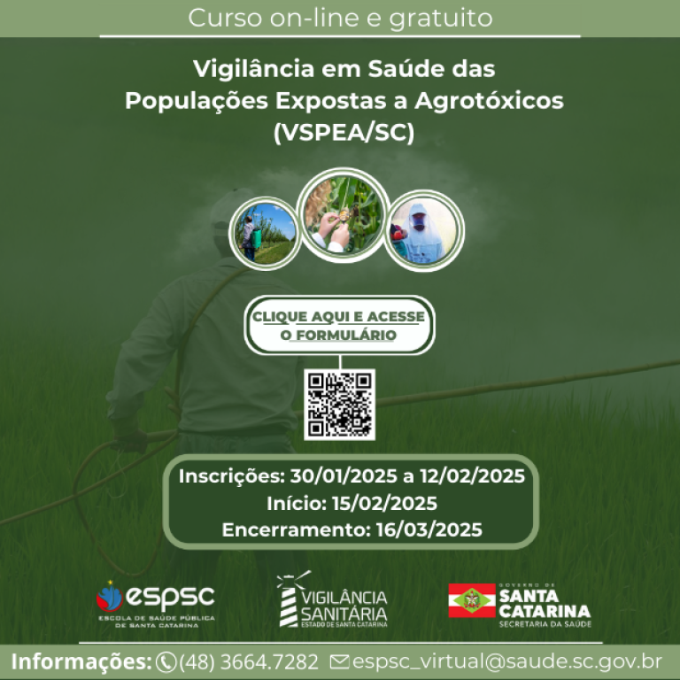 A Secretaria de Estado da Saúde de Santa Catarina (SES/SC), por meio da Diretoria de Vigilância Sanitária do Estado e da Gerência em Saúde Ambiental (DIVS/GESAM), em parceria com a Escola de Saúde Pública de Santa Catarina (ESPSC), promove a 4ª turma do curso Vigilância em Saúde das Populações Expostas a Agrotóxicos (VSPEA/SC).