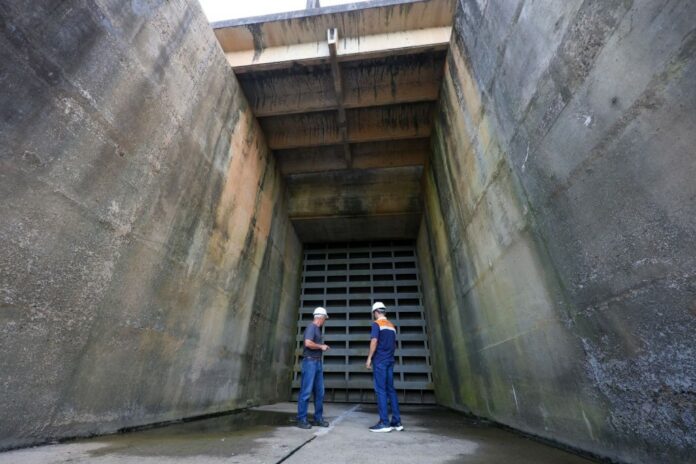 As bombas de drenagem instaladas estão localizadas no interior da galeria da barragem, dentro da galeria do vertedouro. Essas bombas desempenham um papel crucial na prevenção da perda de opressão da barragem, garantindo que o fluxo de água seja devidamente controlado e que a estrutura não perca a pressão necessária para sua operação segura. A intervenção realizada até o momento inclui a instalação de duas novas bombas de drenagem, a renovação das tubulações e a atualização da parte elétrica. Os antigos disjuntores foram substituídos, e os quadros elétricos, que datavam da década de 1970, passaram por uma atualização com aterramento, reforçando a segurança do sistema.