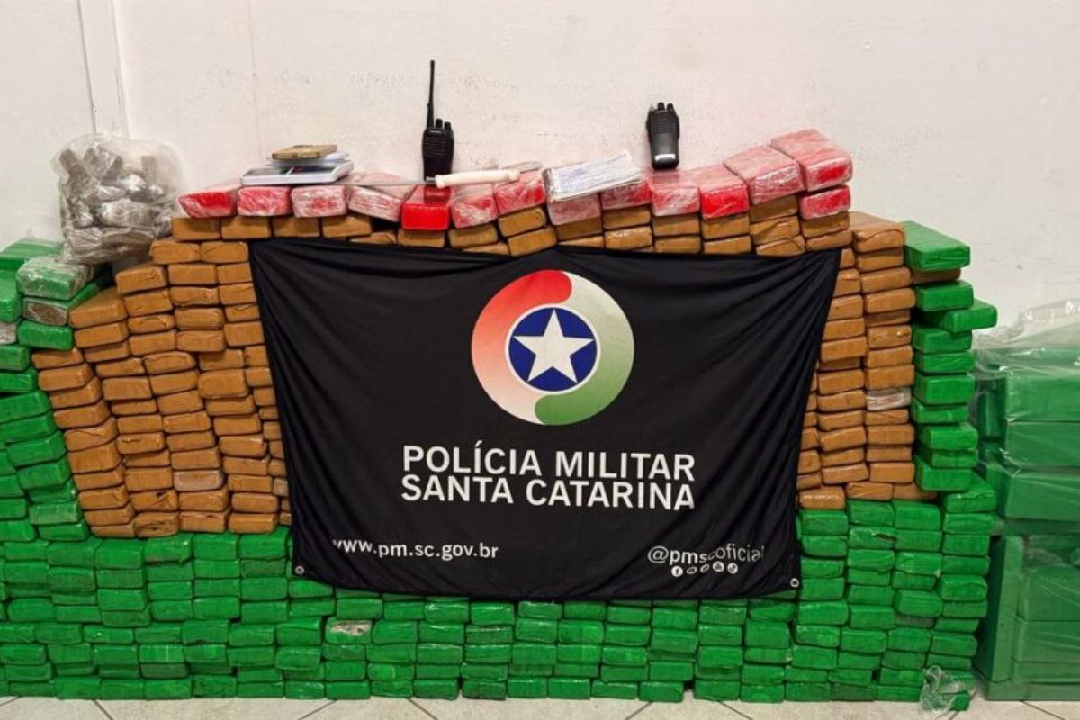 Em Camboriú, na Rua Rodolfo da Silva Simas, em um imóvel, foram aprendidos 341kg de maconha, avaliados em mais de 500 mil reais, além de balança de precisão e caderno com anotações financeiras do tráfico de drogas.