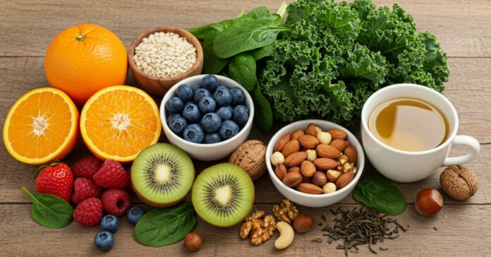 Laranja, limão, tangerina e kiwi são fontes abundantes de vitamina C, um antioxidante que aumenta a produção de células de defesa e combate os radicais livres que enfraquecem o organismo. O consumo regular dessas frutas contribui para a manutenção de um sistema imunológico saudável.