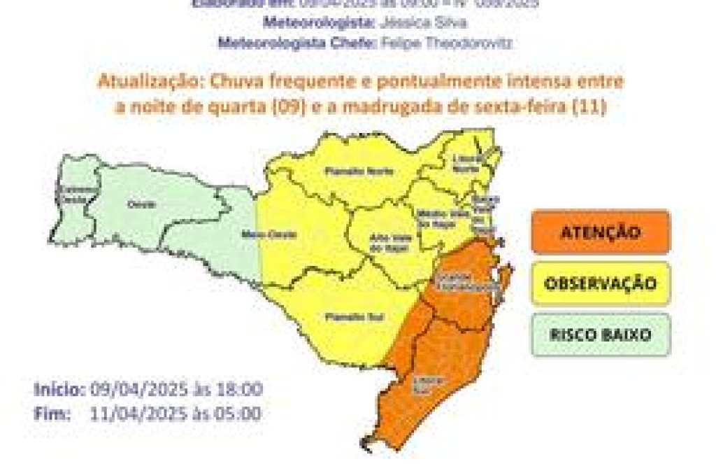 A Defesa Civil de Santa Catarina emitiu alerta para possibilidade de chuva frequente e pontualmente intensa entre a noite desta quarta-feira (9) e a madrugada de sexta-feira (11). A Defesa Civil de Balneário Camboriú seguirá acompanhando os boletins estaduais.