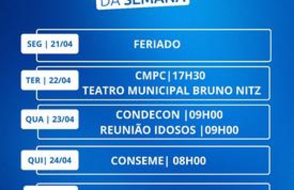 O primeiro encontro será do Conselho Municipal de Política Cultural (CMPC) na terça-feira (22), às 17h30. A reunião acontecerá no Teatro Municipal Bruno Nitz, na Avenida Central, esquina com a Rua 300, no Centro. A reunião do Conselho Municipal de Assistência Social (CMAS) desta semana será feita on-line, na sexta-feira (25), às 9h.